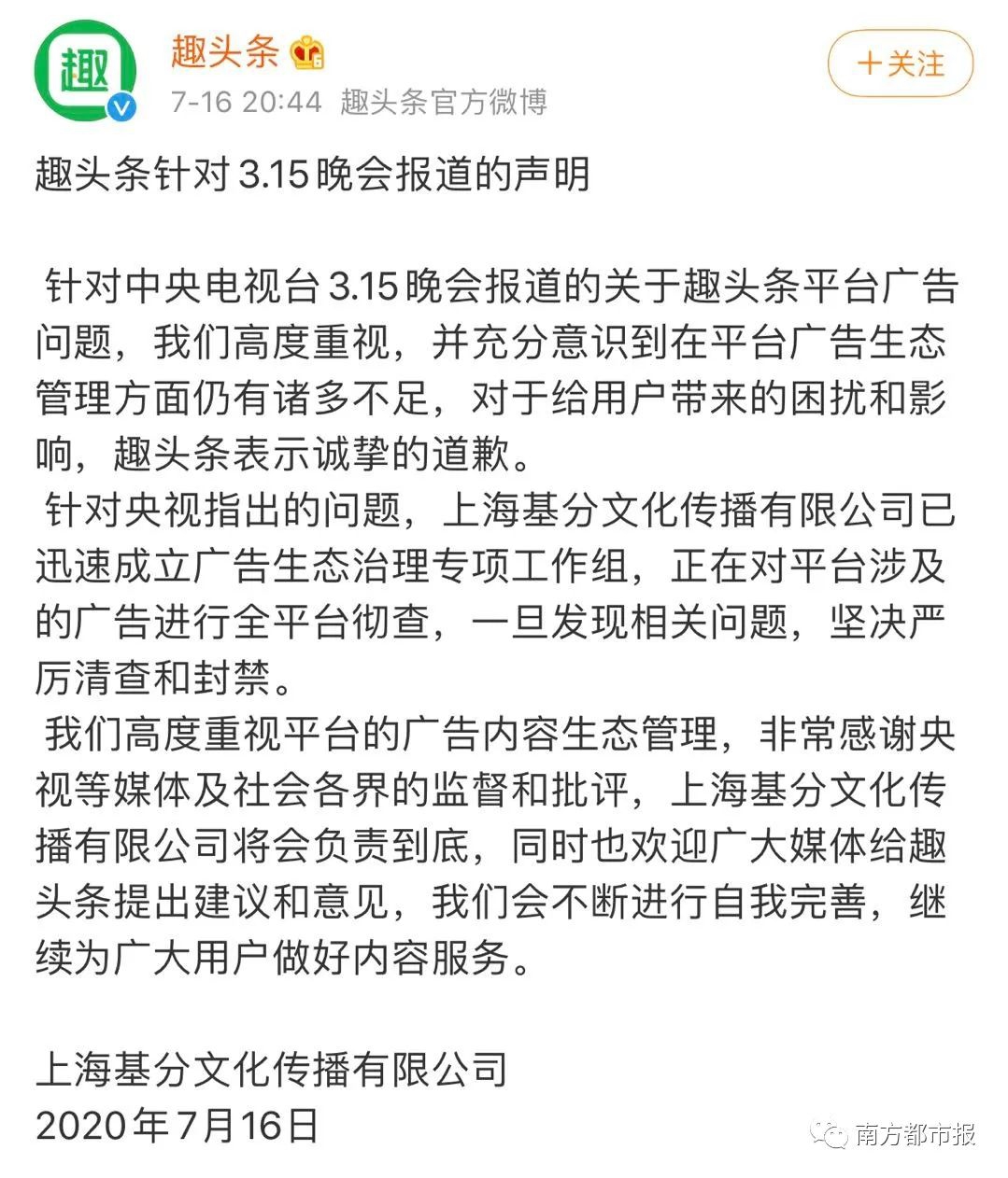 对此,趣头条官方在微博回应称,公司已迅速成立广告生态治理专项工作组,正在对平台涉及的广告进行全平台彻查,一旦发现相关问题,坚决严厉清查和封禁。