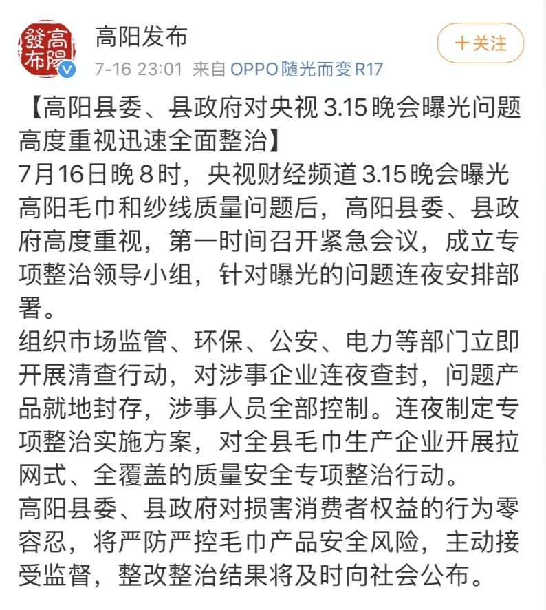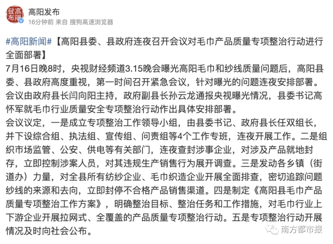 据@高阳发布 今早消息,7月16日晚8时,央视财经频道3.15晚会曝光河北高阳毛巾和纱线质量问题后,河北高阳县委、县政府高度重视,第一时间召开紧急会议,成立专项整治领导小组,针对曝光的问题连夜安排部署。