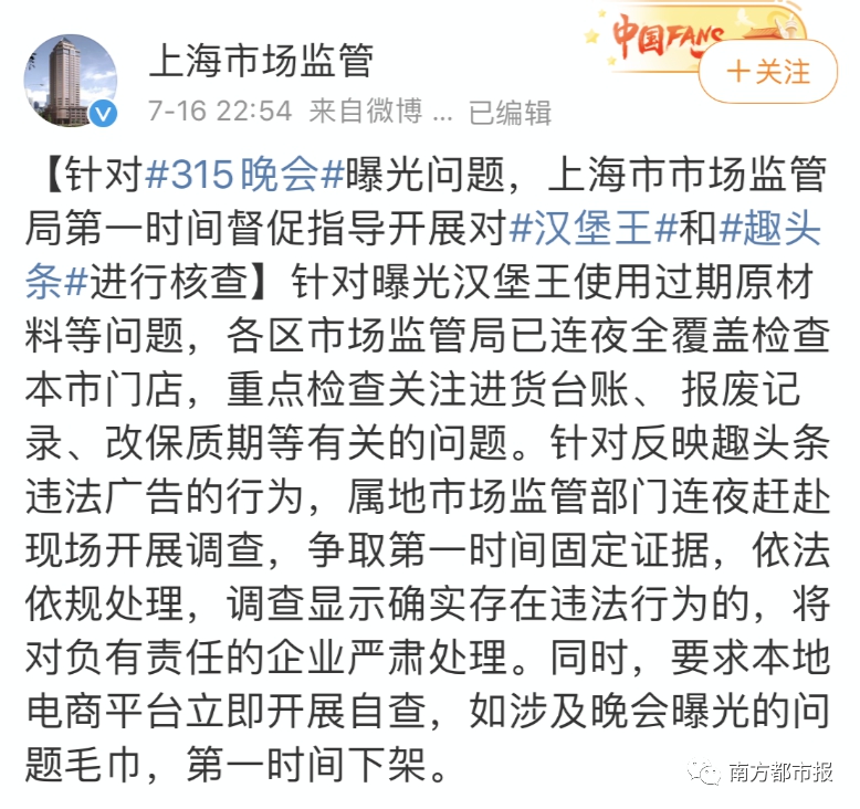 昨天(16日)约23时,上海市市场监督管理局在官方微博表示,已第一时间督促指导开展对汉堡王和趣头条的核查。