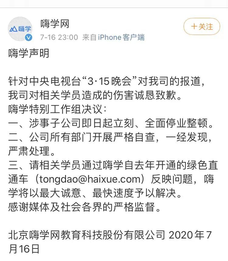 昨天(16日)23时,“嗨学网”官方微博发布声明称,该司对相关学员造成的伤害诚恳致歉。嗨学特别工作组决议:涉事子公司即日起立刻、全面停业整顿;公司所有部门开展严格自查,一经发现,严肃处理;请相关学员通过嗨学自去年开通的绿色直通车反映问题。