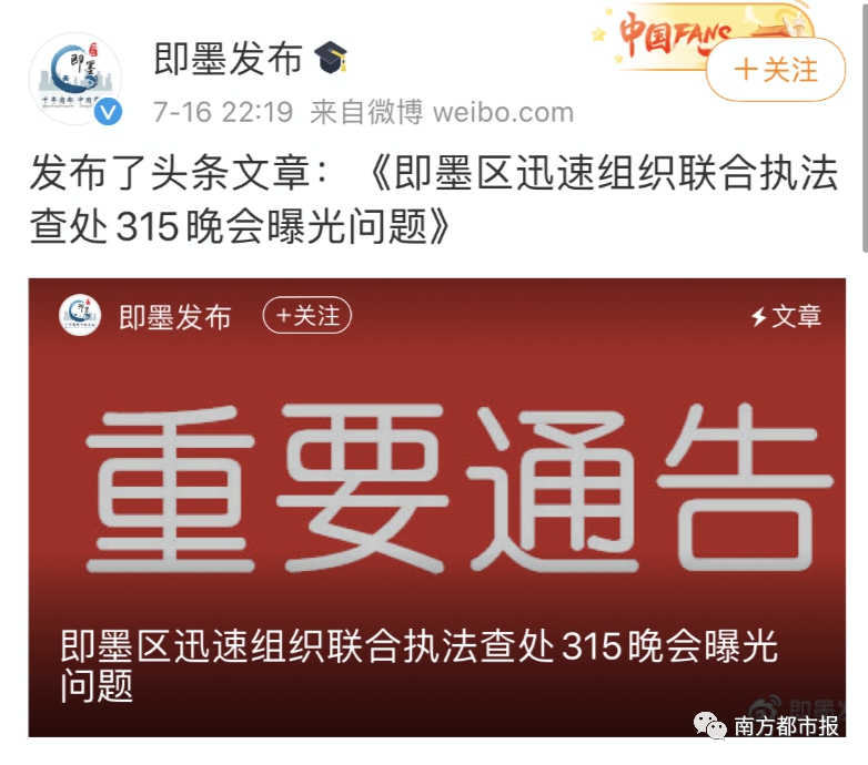 3·15晚会上,山东青岛即墨区部分“养海参整箱放敌敌畏,南方海参冒充北方海参”被点名。昨晚劲22时16分,该区新闻中心官方微博“即墨发布”发布通告,称即墨区委区政府高度重视此事,已立即责成即墨区农业农村局、市场监管局、自然资源局、公安分局联合开展执法检查,对相关问题迅速调查、依法处理。