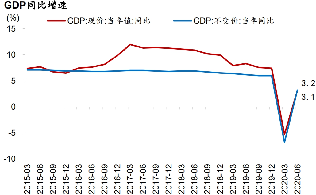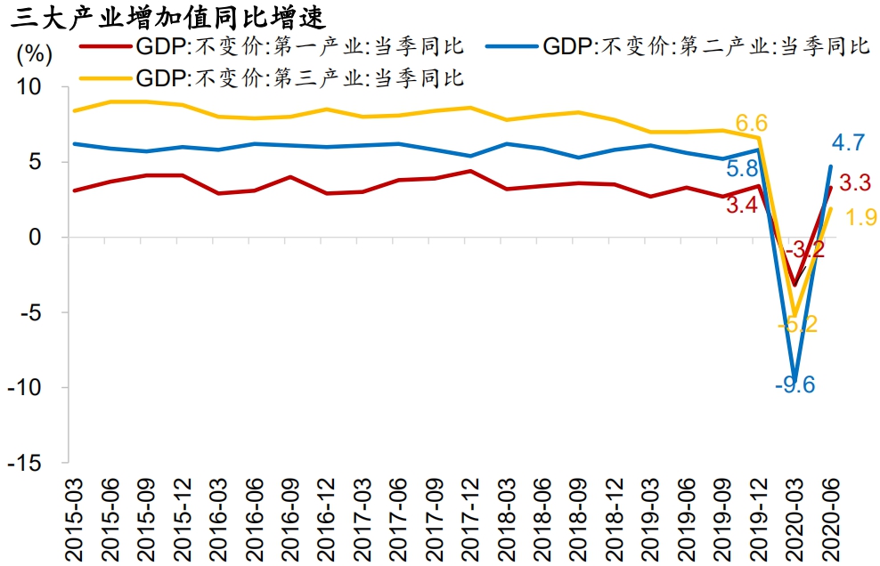 GDP单季同比增速由负转正,但第三产业仍受较大影响。2020年二季度,我国GDP重回正增长:以不变价计,GDP初步核算数为22.6万亿元,同比增长3.2%。