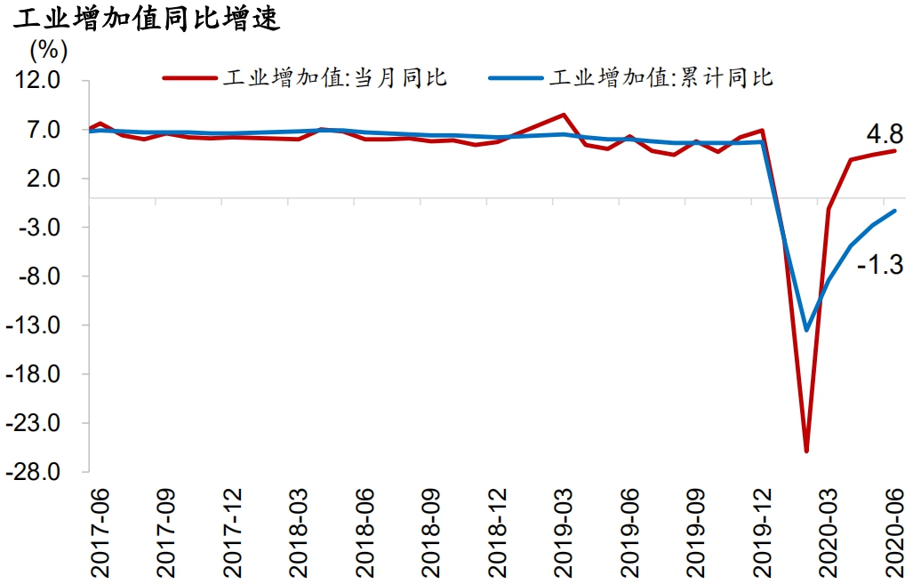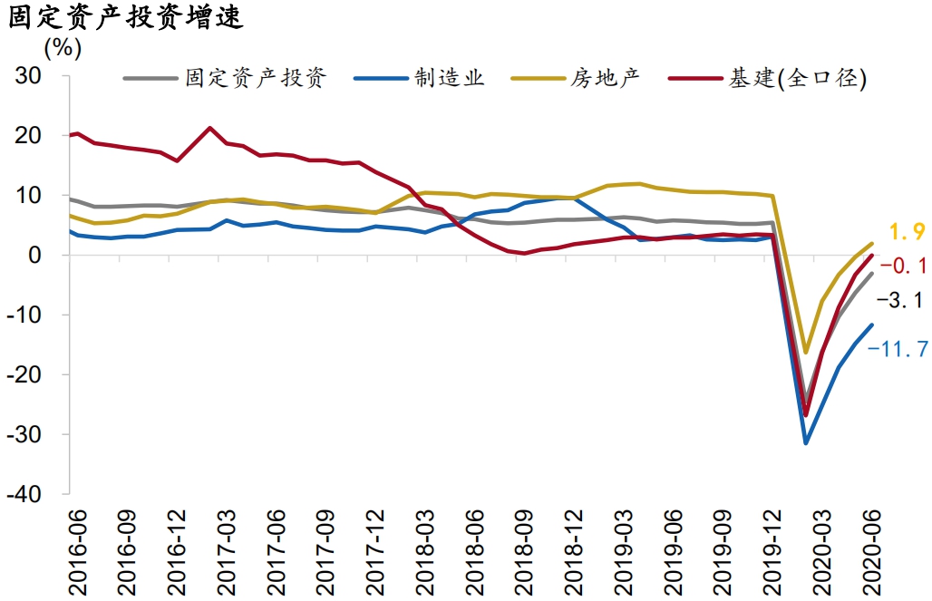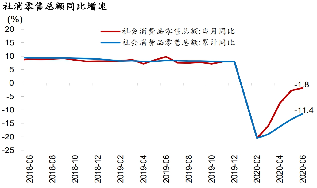 6月经济数据继续回暖,但消费的恢复仍不及预期。规模以上工业增加值当月同比4.8%(前值4.4%,市场预期4.5%);社会消费品零售总额当月同比-1.8%(前值-2.8%,市场预期0.8%);城镇固定资产投资额累计同比-3.1%(前值-6.3%,市场预期-3.5%),其中基建投资同比-0.1%(前值-3.3%),房地产投资同比+1.9%(前值-0.3%),制造业投资同比-11.7%(前值-14.8%)。
