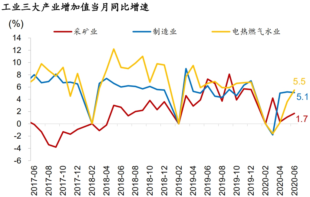 分三大产业看:采矿业和公用事业生产活跃度有所提高,6月采矿业增加值当月同比1.7%,较前值提升0.6pct,公用事业增加值当月同比5.5%,较前值提升1.9pct。制造业生产修复进入瓶颈,当月同比较前值下滑0.1pct至5.1%。