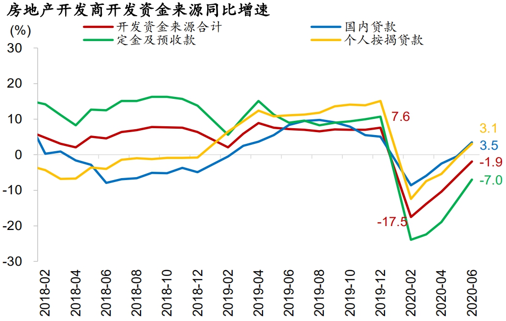 融资环境改善叠加低利率背景,房企资金来源情况持续好转。1-6月开发商资金来源同比-1.9%,较前值提升4.2pct。其中主要受到国内贷款和销售回暖的拉动。从资金来源当月同比的结构来看,国内贷款、按揭贷款、定金及预收款同比均有大幅提升。