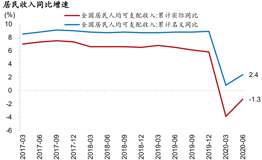 (1)居民收入依旧是制约消费反弹的主要因素。上半年全国居民人均可支配收入名义同比增速较去年末大幅下行6.5pct至2.4%,实际同比增速大幅下行7.1pct至-1.3%。这显著制约了居民消费支出增长。上半年居民人均消费支出名义同比大幅回落14.5pct至-5.9%,实际同比大幅下行14.8pct至-9.3%。