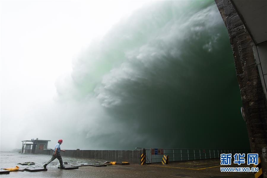 新安江电厂工作人员从正在泄洪的新安江水库坝底经过(7月7日摄)。 新华社记者 翁忻旸 摄