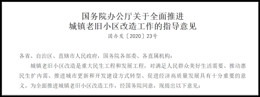 7月20日,国务院办公厅对外发布《关于全面推进城镇老旧小区改造工作的指导意见》,明确提出,2020年新开工改造城镇老旧小区3.9万个,涉及居民近700万户;到“十四五”期末(2025年底),结合各地实际,力争基本完成2000年底前建成的需改造城镇老旧小区改造任务。