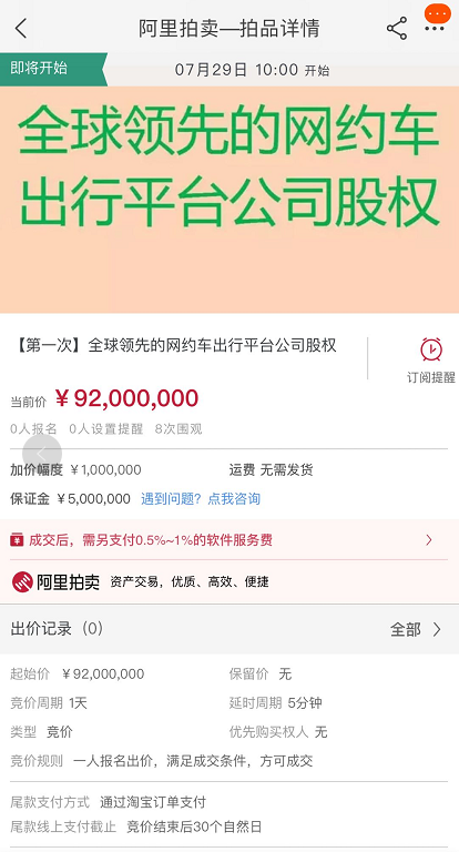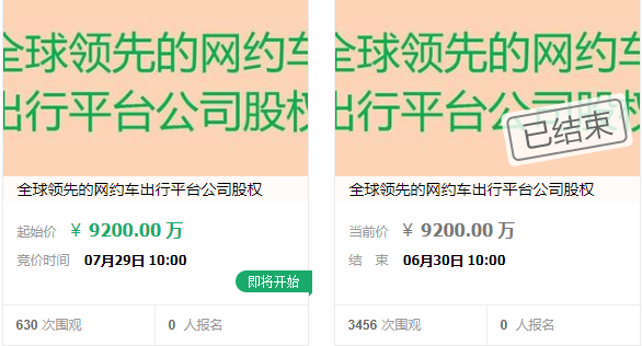 阿里拍卖网信息显示,“全球领先的网约车出行平台公司股权”将于7月29日起公开拍卖,起拍价为9200万元,处置单位为杭州顾得信息技术有限公司。