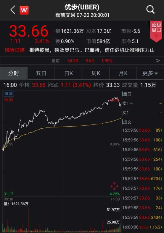 截至7月20日收盘,Uber股价报33.66美元,总市值达584亿美元。按照这一估值,滴滴身价已经超过Uber(优步)。