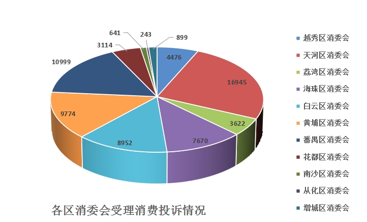 从受理消费投诉归属的行政区域来看,天河区、番禺区、黄埔区、白云区和海珠区仍排列前五,受理量分别是16945件、10999件、9774件、8952件和7670件,受理之和占全市受理量的67.81%。