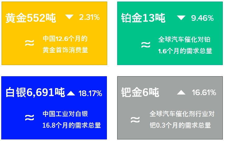 注:(1)为了方便比较,COMEX黄金的金属相当量除以10、COMEX白银的金属当量除以100。(2)目前Nymex钯金的参考性很低。