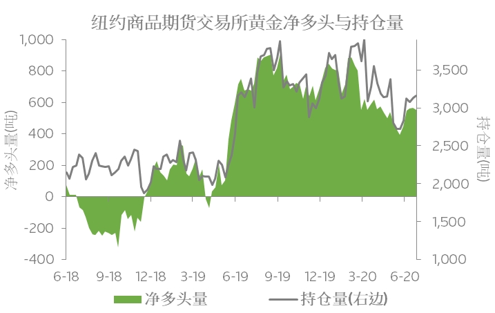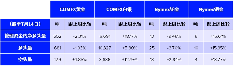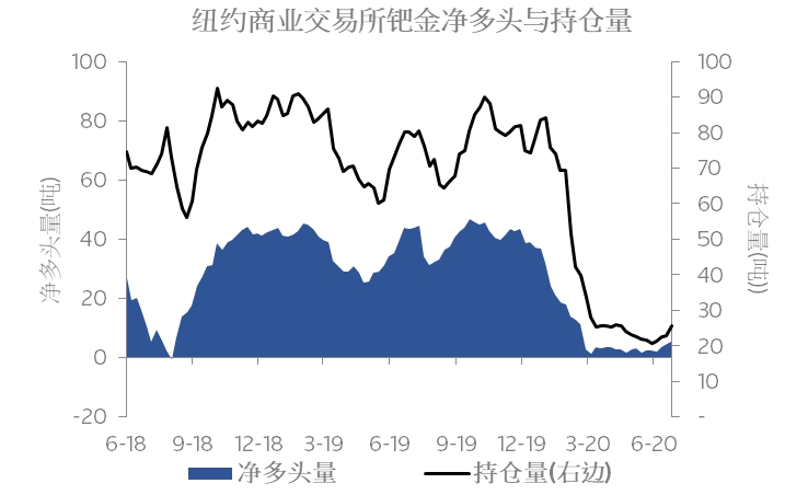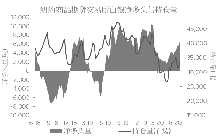 COMEX白银比较平静,多头微升5.8%至10,327吨为过去19周最高水平;空头大幅减少11.3%至3,636吨为过去3周最低。管理资金的白银净多头结果急升18.2%至6,691吨,相当于中国约16.8个月工业对白银的需求(前一周为14.1个月)。作为参考,白银净多头的最高水平曾达15,372吨(2017年4月),相当于中国工业39.9个月的需求,现水平已跟历史高位有一大段距离。