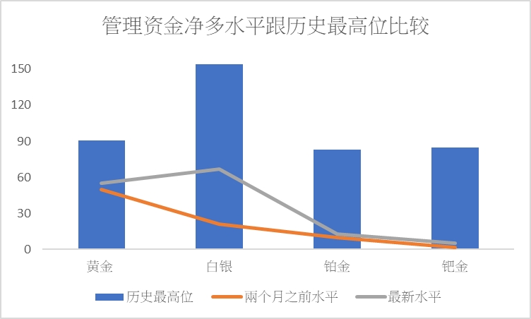 现时管理资金在各金属最新操作,跟历史高位水平的差距比较: