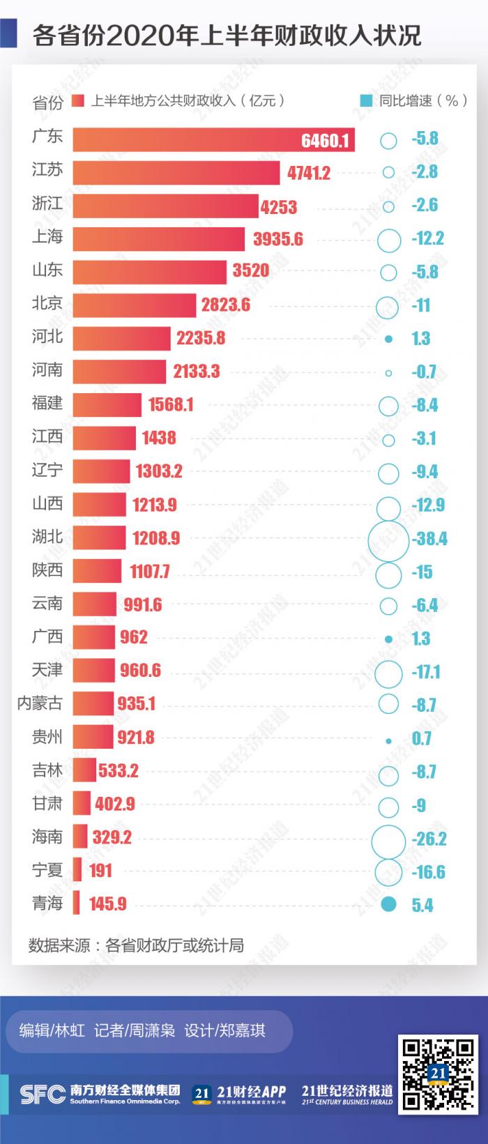 受疫情影响最大,湖北上半年财政收入下降38.4%;疫情大幅冲击旅游经济,海南上半年财政收入下降26.2%。