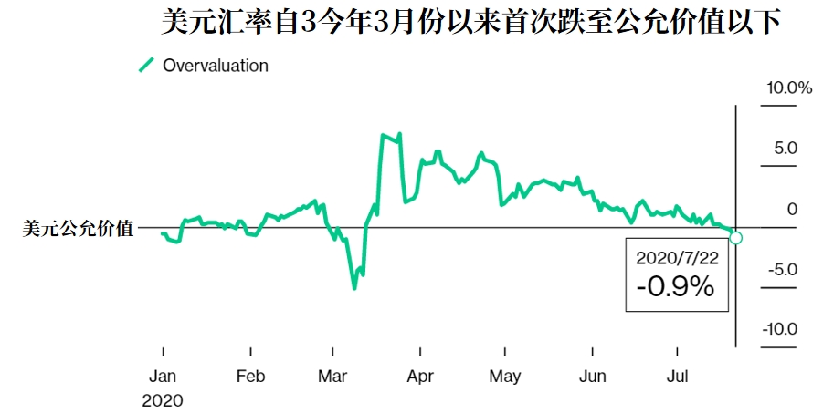 和年初的风光无限相比,美元如今颓势尽显。数据显示,美元汇率自3月份市场崩盘以来,首次跌至公允价值以下,较公允价值低近1%。美元指数也节节下挫,失守95关口,周五更是跌破前低94.632,创2018年9月底以来新低。