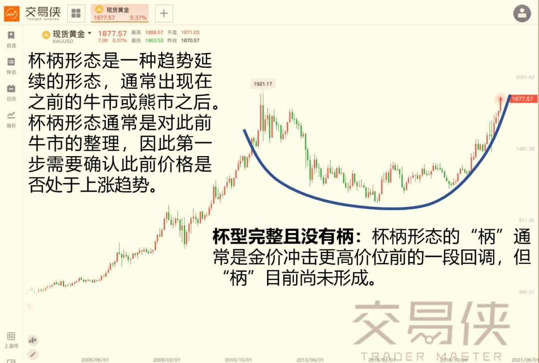 金十此前曾报道过,技术面上,黄金已经出现新一轮突破信号。从月线图来看,黄金的走势是一个标准的杯柄形态,这种形态通常出现在牛市或熊市之后,是对此前牛市的整理,在形成突破前需要确认黄金是否仍处于上涨趋势。