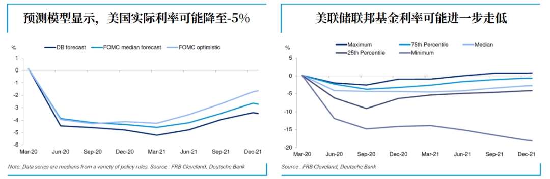 对于美联储的利率前景,克利夫兰联储提供了一个预测模型。根据该模型,美联储的实际联邦基金利率低至-5%,且未来一段时间的下行风险要远高于上行可能性。该工具通过对通胀和失业率的量化测算,推导美联储的货币政策路径。德银首席美国经济学家卢加蒂解释了为什么会出现这种结果: