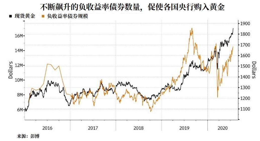 至于黄金一贯的忠实拥趸——央行,更是不遗余力继续疯狂扫货。根据世界黄金协会的数据,截至今年上半年,黄金在全球央行外汇储备中所占的份额,已经从2019年底的4.2%上升到4.8%,今年新增的大部分黄金储备,都是为了取代负收益率债券。