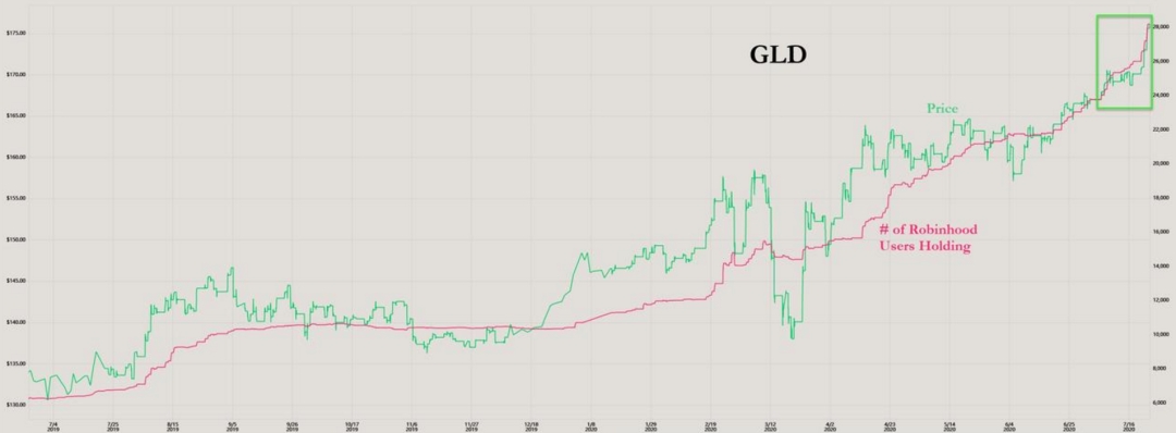 而美国的散户,更是近期崛起速度最快、购金速度最惊人的一群多头。如下图所示,到目前为止,美国券商Robinhood的线上交易平台上,已有超过28000个散户持有黄金ETF。
