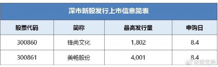 7月27日,深交所公告称,北京锋尚世纪文化传媒股份有限公司(简称:锋尚文化)和杨凌美畅新材料股份有限公司(简称:美畅股份)披露招股书,拟于近期在深市发行新股并上市。