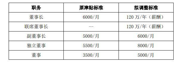其中,最吸引眼球的是,公司董事长津贴标准拟由6000元/月调整为120万元/年(薪酬),公司联席董事长薪酬拟定为120万元/年。此外,公司副董事长津贴标准拟由5000元/月调整为6000元/月,独立董事津贴标准拟由5500元/月调整为8000元/月,董事津贴标准拟由3500元/月调整为5000元/月。