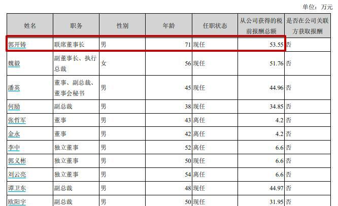实际上,原董事长、现联席董事长郭开铸2019年从公司获得的税前报酬总额为53.55万元。