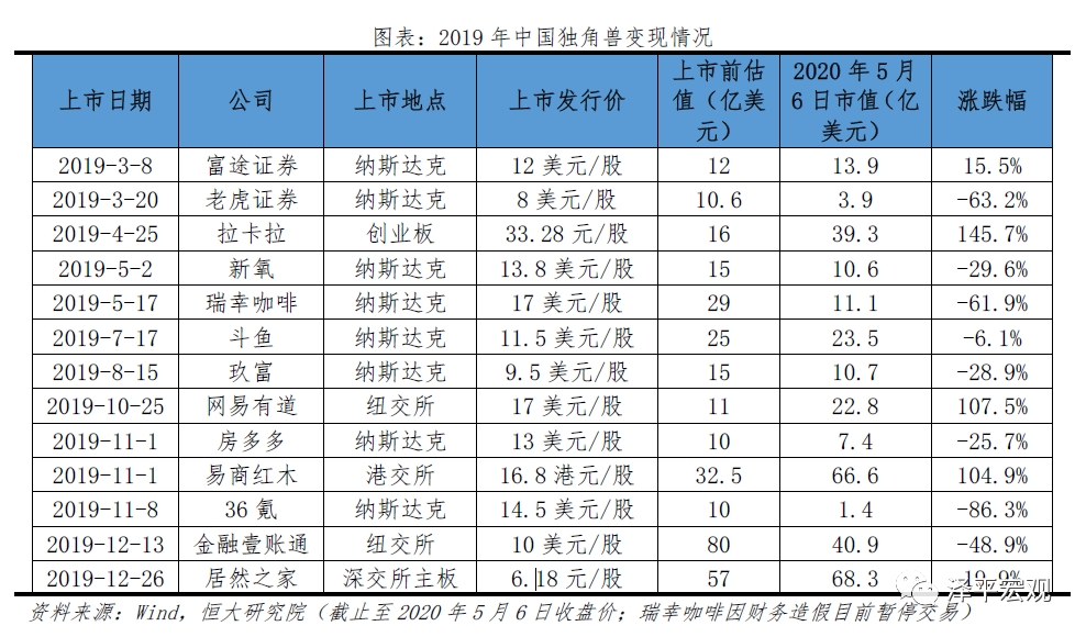 中国独角兽上市频率降低,主要选择美股市场。据统计,2019年全年,中国内地共13家独角兽实现上市,较去年减少6家。从上市企业类型来看,主要为中小型独角兽,61.5%上市前估值在10亿-15亿美元区间,主要因为独角兽企业短期普遍无法盈利,中小型独角兽较超级独角兽企业和行业头部企业承受更大的融资和运营压力,上市需求更急迫。从上市地点来看,2019年中国独角兽在纳斯达克共上市8家,其次为纽交所2家。2019年3月科创板推出也对独角兽上市造成分流,众多独角兽企业目前处于观望状态。2019年港交所上市的独角兽企业从2018年8家下滑至1家,其余深交所主板、创业板各有1家独角兽上市。截至2020年5月6日,市值较上市前估值上涨共5家、下跌共8家,36氪跌幅最大、缩水86.3%,第三方支付企业拉卡拉涨幅最大、上涨145.7%。
