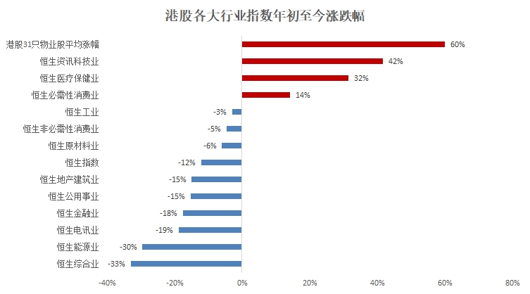 科技、医疗、消费作为市场热度最高的三大板块,取得正收益,算是在估计之中,但是可能令投资者深感意外的是,港股的物业板块与之相比,不仅毫不逊色,相反,如果按照算术平均来计算港股31只物业股年初至今的涨跌幅,那么投资者会发现,物业板块今年的平均涨幅高达60%,大幅超越科技、医疗和消费这三大板块。