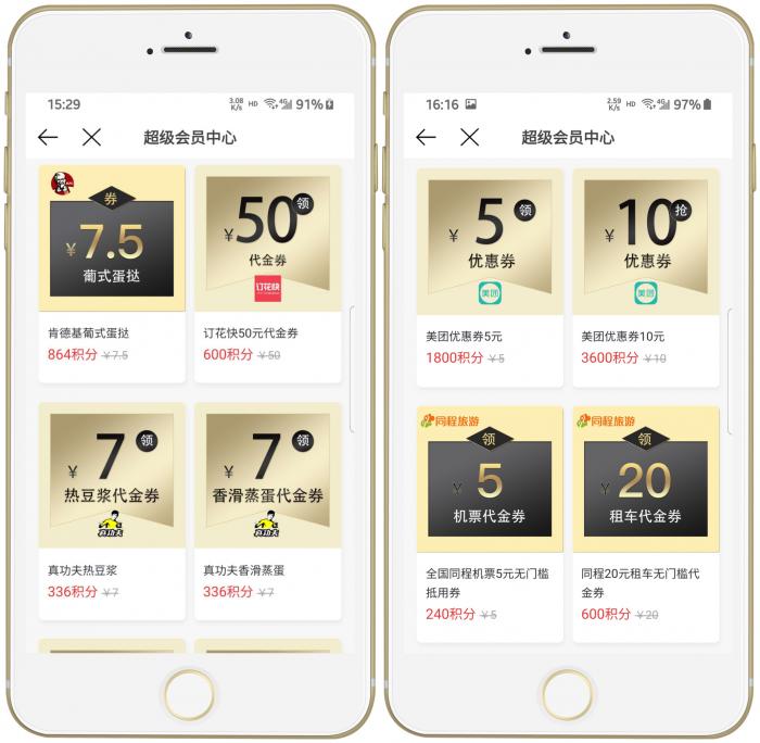 积分商城还新增了一系列的优惠券福利,邀请猫眼、美团、同城旅游、喜马拉雅、滴滴快车、货拉拉、优酷、真功夫等积分兑换抵用券的共同加入,为用户提供更多优质服务。