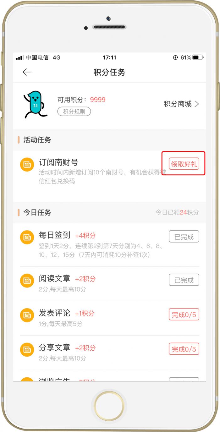 点击“活动任务:订阅南财号”:领取好礼,