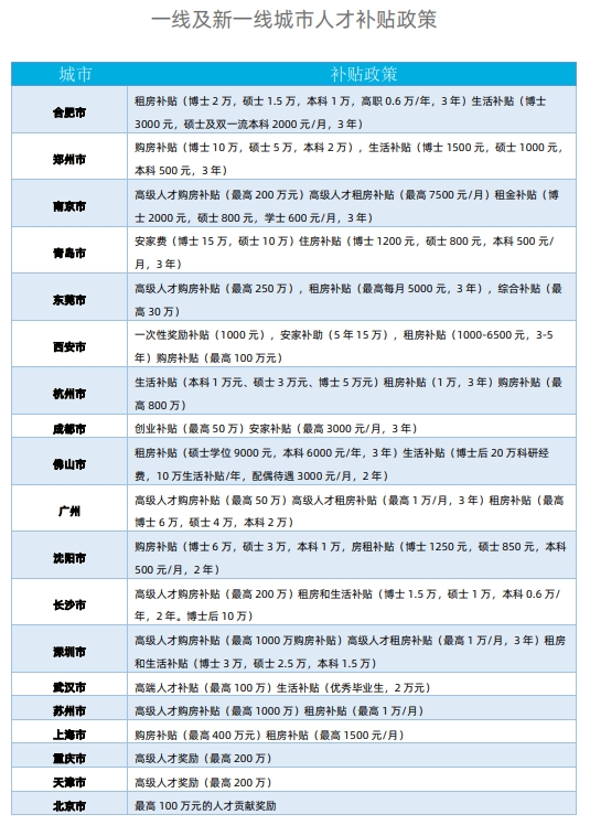 “高端人才无论一线城市还是准一线城市均为紧缺资源,因此各城市都有针对高端人才的大额补贴,而准一线城市为了吸引人才通常在学历人才的房租和生活补贴上额度较高。”贝壳研究院显示。