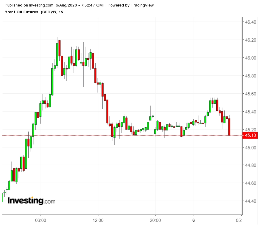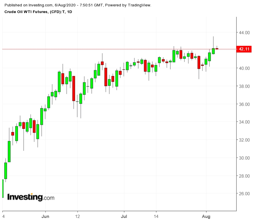 油价下跌的原因在于,报道称欧佩克+产油国将从8月1日开始提高产量。WTI上周五跌至每桶40美元以下,到8月5日(周三)一度攀升至每桶43美元以上,而布伦特原油价格也接近每桶46美元。
