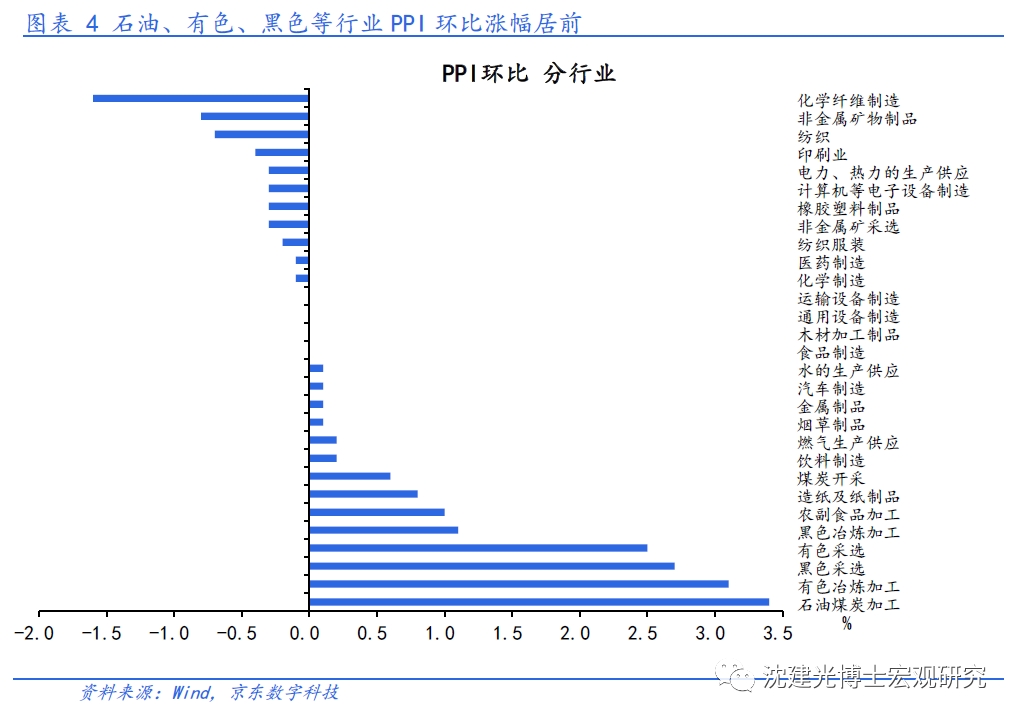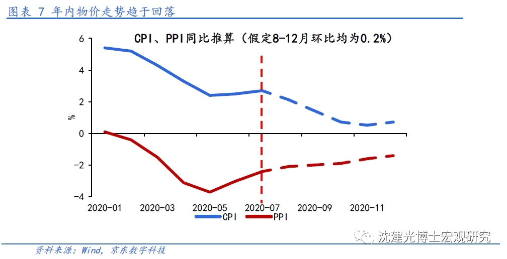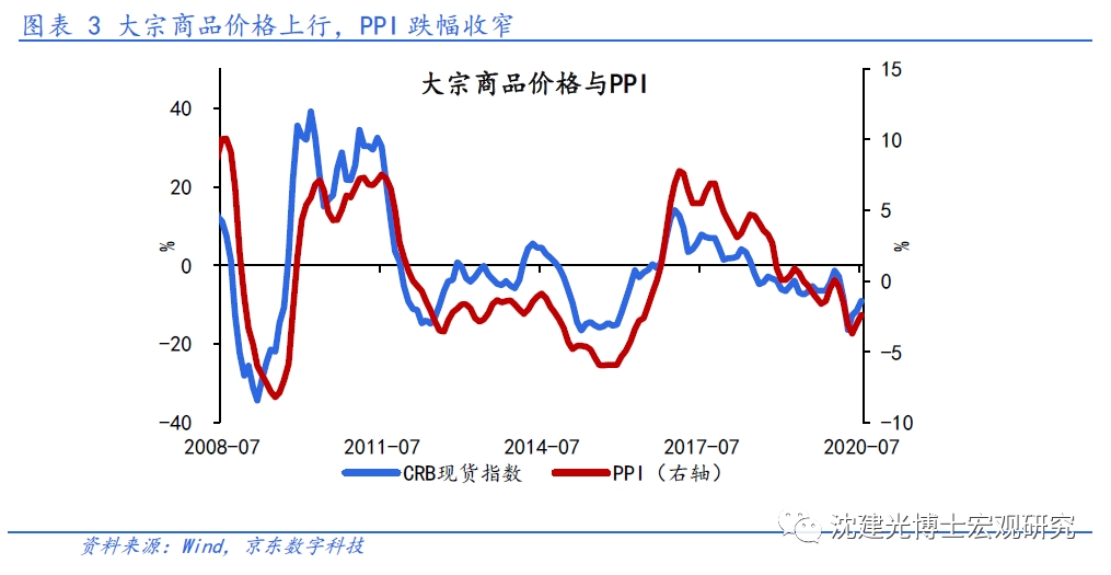 大宗商品价格上行,PPI跌幅收窄。伴随工业生产持续回升、市场需求逐步回暖,7月国际油价、CRB现货指数同比跌幅分别降至32%、-9%;国内黑色、有色等工业品价格也出现不同程度的上行。因此,PPI环比上涨0.4%,同比进一步回升至-2.4%。分行业看,石油相关(油气开采、石油煤炭加工等)、有色采选和加工、黑色采选和加工、农副食品加工等行业环比涨幅居前。
