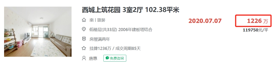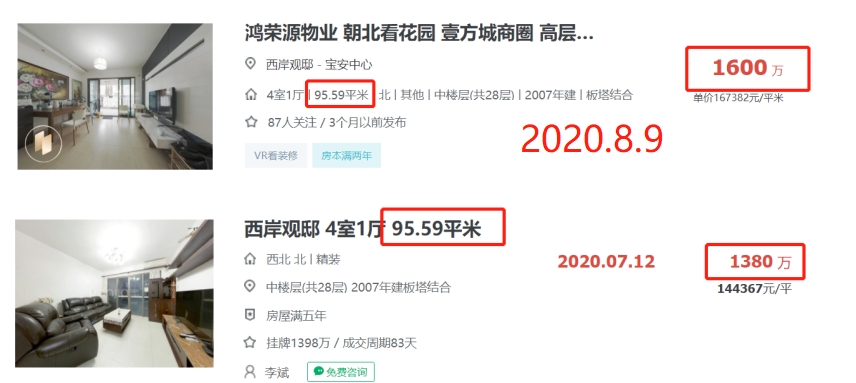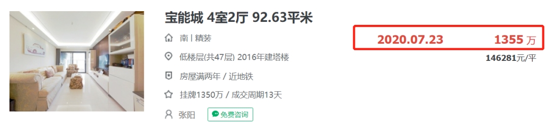 92㎡的户型在5月成交总价为1155万,7月23号为1355万。