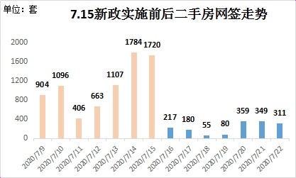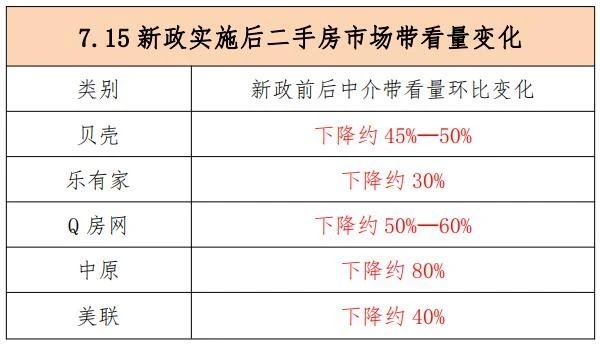 据深房中协数据统计,715新政实施前后(各自一周时间)带看量环比平均下滑50%左右,各机构成交量下滑幅度达61%。