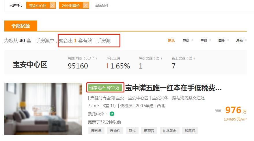 南方楼事以宝安中心为例,从5-10号期间,在诸葛找房筛选过3次24小时降价房源,发现1197套二手房源中,只有1套降价房源。