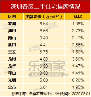 据乐有家数据显示,7月各片区二手住宅挂牌价环比仍是微涨。