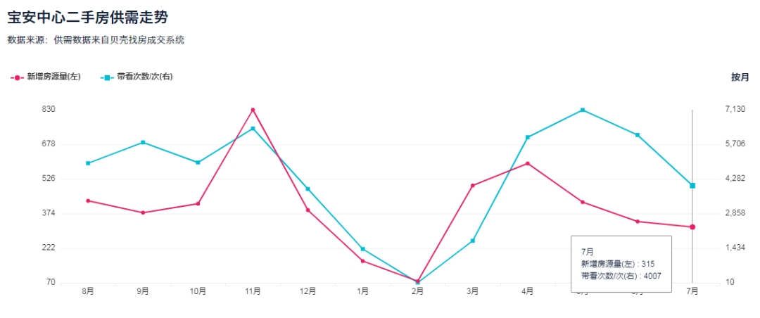 在贝壳官网查看二手房供需走势,可以看到二手新增房源在4月之后一直呈下降趋势。