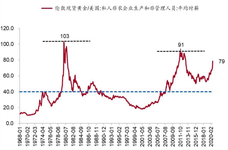 具体来说,我们对比了伦敦黄金现货/美国私人非农企业生产和非管理人员的平均时薪,观察到黄金对劳动力的购买分别在1980年和2011年达到90-100的极值水平,也就是说,如果每盎司金价能购买90-100个小时的美国底层劳动力的劳动,那么此时的金价很可能已处于极度高估的水平,面临反转风险。