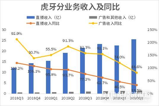 虎牙的收入来源于直播收入和广告收入,直播收入是主要收入来源,2020年二季度,直播收入占总营收的比例为95.1%,广告收入仅占4.9%。