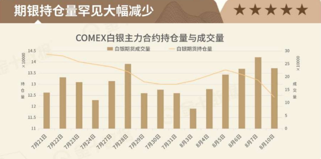 另一方面,虽然金银比距离历史平均水平仍有一段距离,但三周时间内下降超25%,这个速度已超出不少人的预期;此外,期银成交量和持仓量双双下挫,量价背离表明市场可能对白银目前的涨势不够认同,尤其是持仓量大幅减少近6%,降幅为近期罕见。