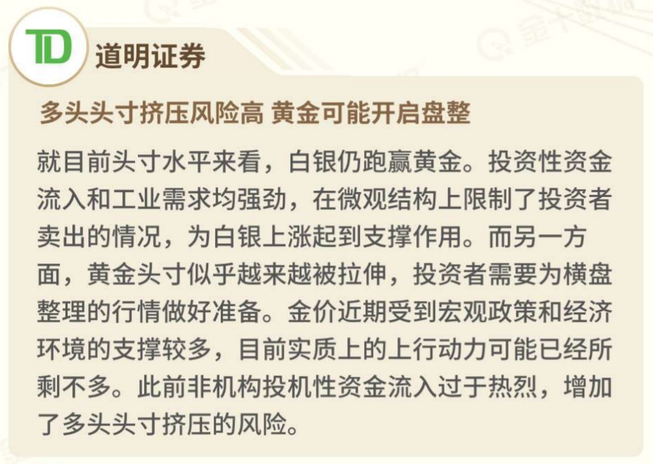 道明证券也分享了最新看法:多头头寸挤压风险高 黄金可能开启盘整。