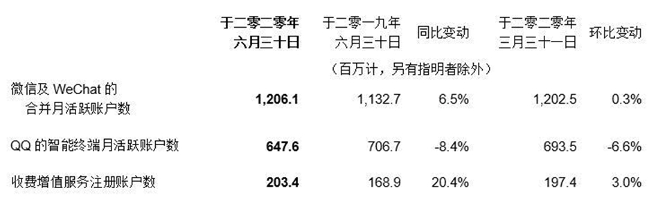 在用户数据方面,腾讯微信及WeChat的月活跃帐户12.1亿,QQ的智能終端月活跃账户数6.47亿,去年7.07亿,同比下降8.4%。