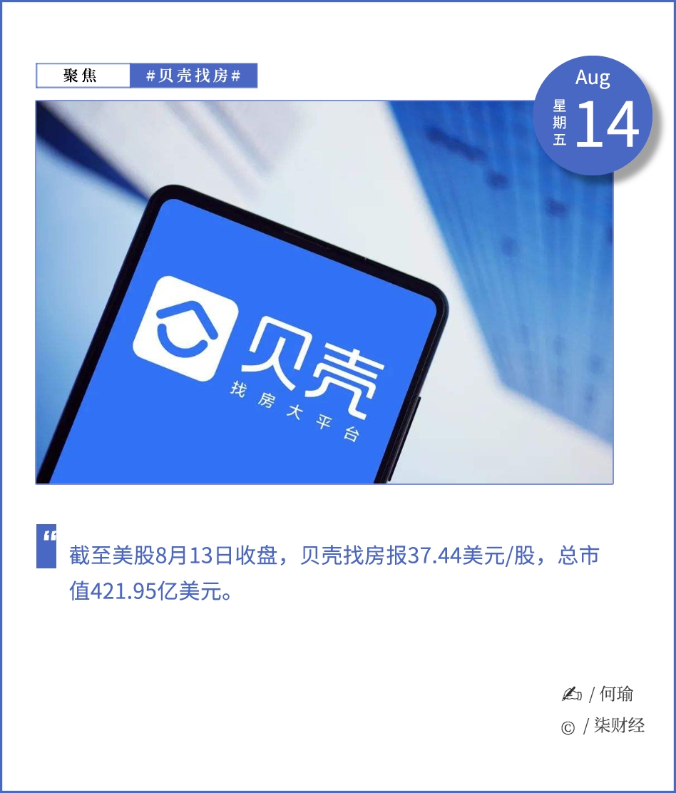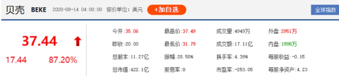 贝壳找房的上市也为投资方带来了收益。开始交易后,贝壳找房最高涨至37.49美元/股,最低报价31.79美元/股。截至美股8月13日收盘,贝壳找房报37.44美元/股,总市值421.95亿美元。