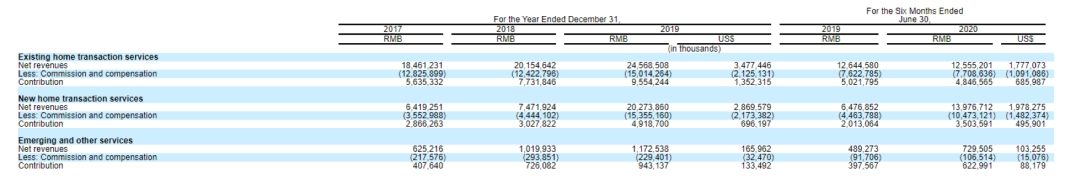 从2017年至今的数据来看,新房交易服务在贝壳找房总收入中的占比不断提高,并在2020年上半年超过现有房屋交易服务收入。而根据贝壳找房运营模式,每一笔业务完成需要给予内部代理商和销售专业人员直接补偿,并向此类服务的关联代理商和其他销售渠道分配佣金。