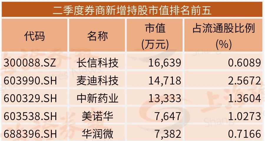二季度,有哪些个股获得券商的新进重仓?按照新增持股市值从高到低排名,长信科技、麦迪科技、中新药业、美诺华、华润微位居前五。