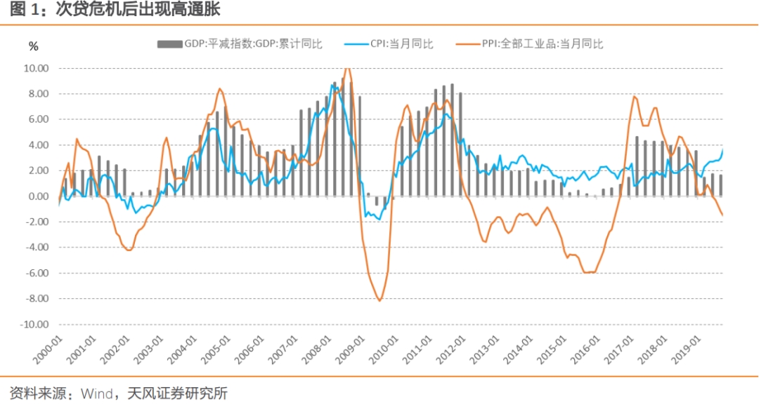 让市场记忆犹新的是2008年次贷危机,在全球货币宽松和刺激政策的带动下,2009年8月开始CPI、PPI双双触底回升,并在随后两年演变成高通胀局面(CPI、PPI、广义资产普涨)。