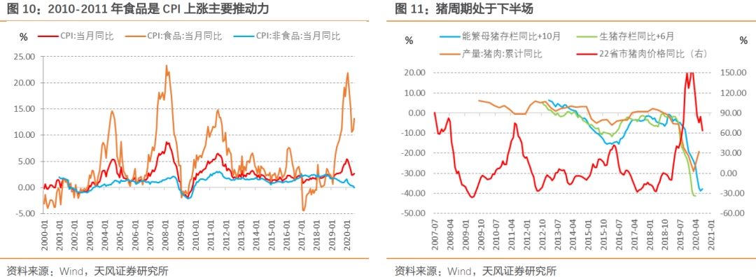 2010-2011年CPI上行,虽然部分缘于能源等商品价格带来的输入型通胀压力,但涨幅最大的主要还是食品。当时恰好处于猪周期上半场,猪油共振下通胀高企。本次不同之处在于,三年猪周期进入下半场,随着猪肉产能逐步恢复明年猪肉价格预计继续回落,猪通胀压力明显减轻。