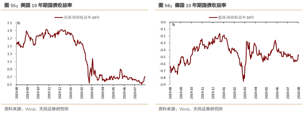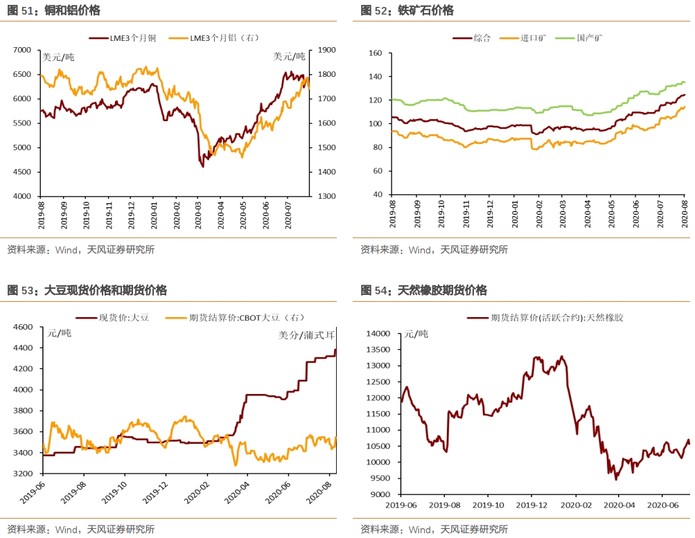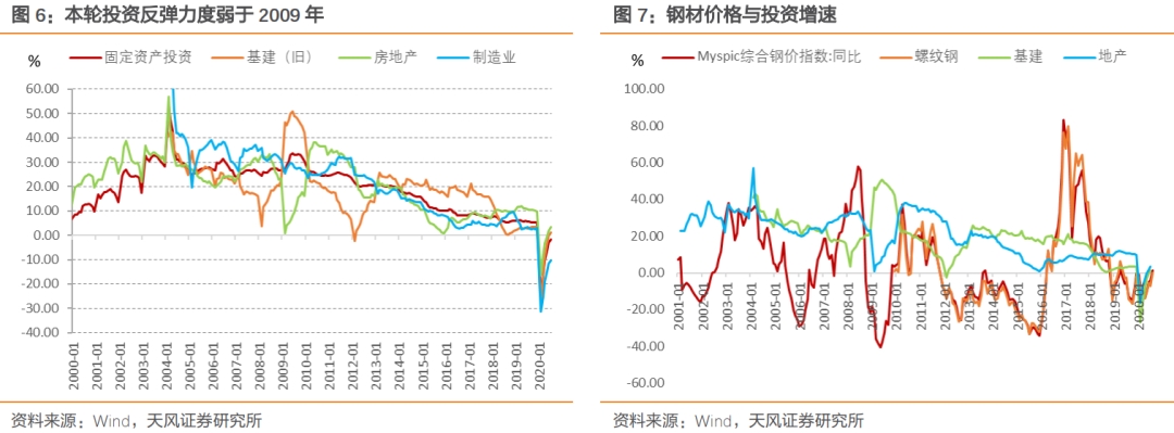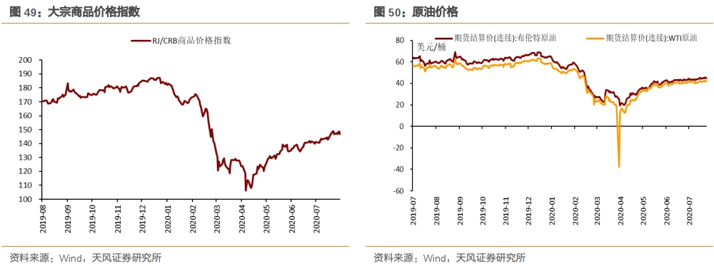 但是也需要关注本轮国内逆周期政策力度显著弱于次贷危机之后。次贷危机之后,基建投资增速由20%快速攀升至2019年年中的50%附近,同时地产投资继续发力,2019年固定资产投资增速由26.5%升至30.4%,投资拉动作用非常明显。当前基建投资虽有力度但算不上强刺激,地产刚刚抬头调控政策再度加码,7月30日政治局会议强调“完善宏观调控跨周期设计和调节,实现稳增长和防风险长期均衡”。这是一种崭新的调控思路,毕竟2009年类似措辞的出台背景是经济已经回到8%附近,当前政策调整是建立在二季度GDP3.2%这个弱基础上。假设全年基建增速10%-15%,地产5%-7%,制造业投资-3%,固定资产投资增速至多回到5%附近,难以高于去年水平(5.4%)。因而,本次投资刺激虽然不弱,但是求稳的思路下,经济恢复速度预计还是偏慢,至少直接过渡到经济过热的进程没那么快。